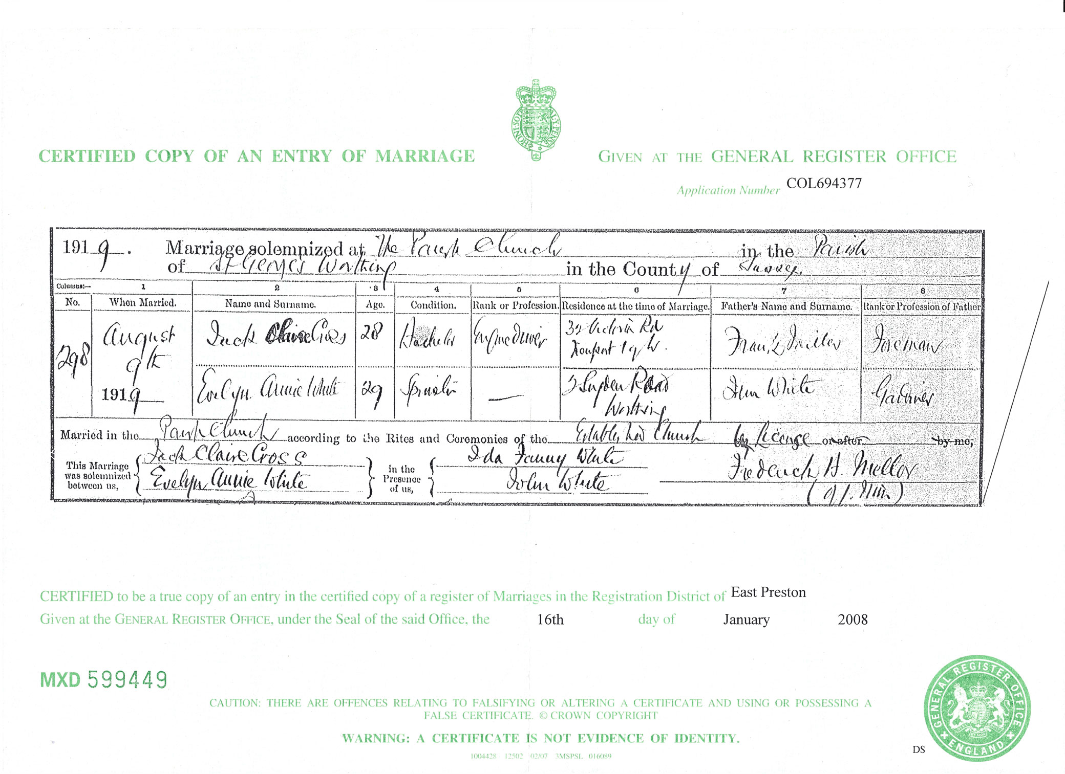 Marriage Certificate Jack Claire Cross & Evelyn Anne White -9 August 1919